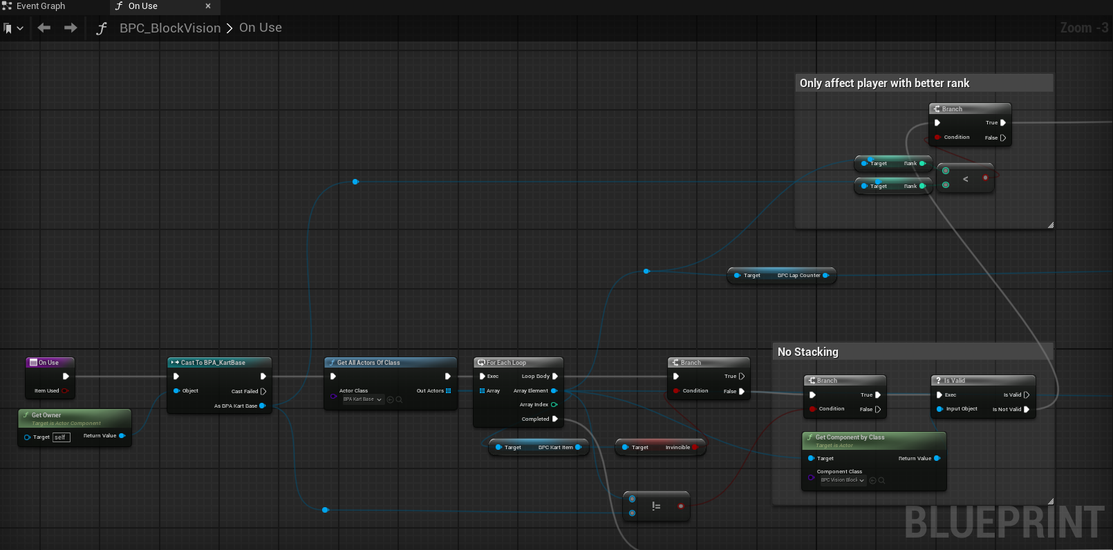 For the logistical side, Vision Block only affects player’s in front of you - as seen as the blueprint runs your rank versus the other players to see which is higher